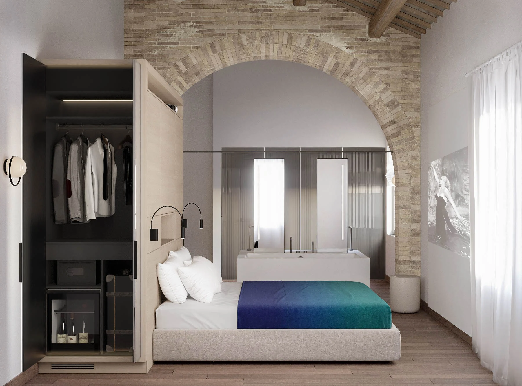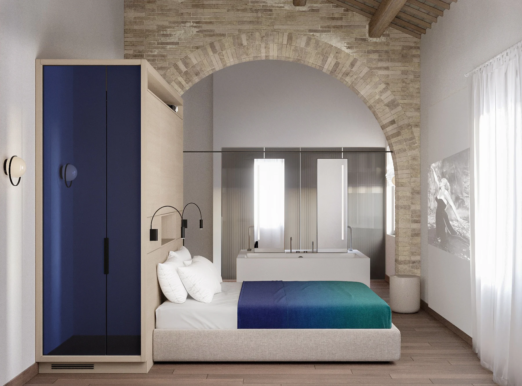 The rooms are characterized by original wooden beams stretch overhead across the ceiling and brick archways that visually divide the space in two zones. Due to the modest sizes of the rooms we have chosen to maintain the distinction of two areas maximizing the space. The walls of the bathroom inside the suits have been demolished and replaced with gentle smoked ribbed glass partitions that delimit a toilet and a generous shower cabin.